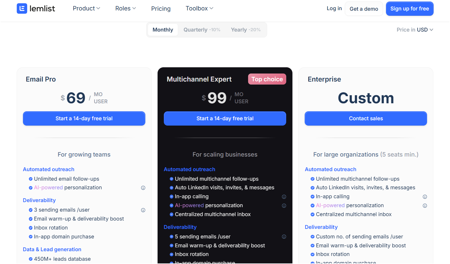 • Email Pro: $69/user/month – 3 senders, Lemwarm, CRM sync, image personalization.